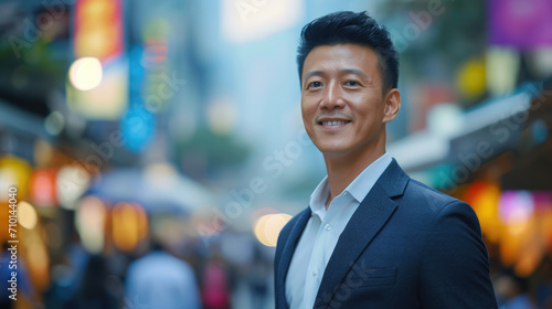 This image features a cheerful Asian businessman in a suit walking through a bustling city street on his way to the office, with the blurred street enhancing the urban vibe.