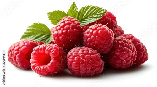 This image features a vibrant collection of fresh raspberries alongside lush green leaves, highlighting their rich red color and juicy texture, evoking freshness and health.