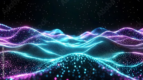 This image features abstract, glowing, undulating terrain under a dark sky sprinkled with points of light, creating a mesmerizing and futuristic landscape effect.;