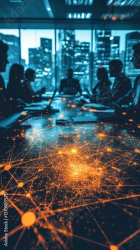 This image illustrates business trends and data analysis, featuring a graph overlay with silhouettes of professionals, all bathed in the warm glow of a sunset, creating a dynamic atmosphere