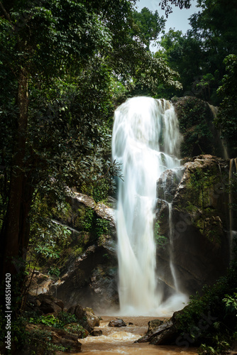This image is a powerful, long-exposure shot of a waterfall in a dense, green forest. The keywords should focus on the elements of water, the surrounding jungle, and the peaceful atmosphere.