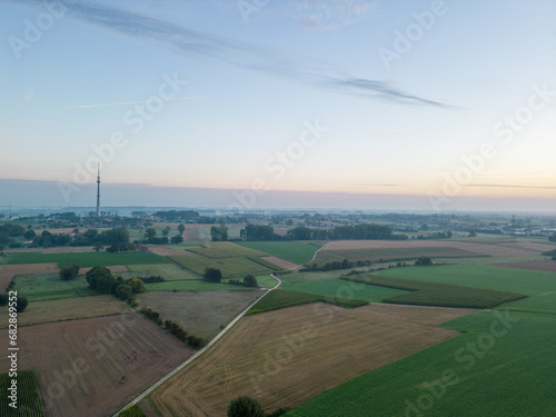 This image offers a peaceful aerial view of patchwork farmland at twilight. The landscape is a mosaic of various crops, creating a quilted pattern of greens and browns that stretch towards the horizon