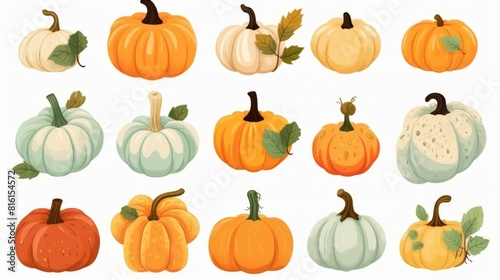 This image presents a collection of pumpkins in various colors and sizes, perfect for seasonal themes