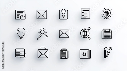 This image showcases a collection of 15 clean monochrome icons representing various business office and technology related concepts such as documents envelopes searching and digital data