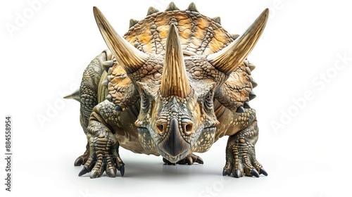 This image showcases a front-facing Triceratops with realistic detailing, illustrating its distinct features such as facial horns, frilled crest, and armored body in vivid accuracy.