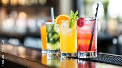 This image showcases a vibrant array of cocktails, skillfully crafted and garnished, perfectly lined up on a bar counter under warm lighting with a blurred background.