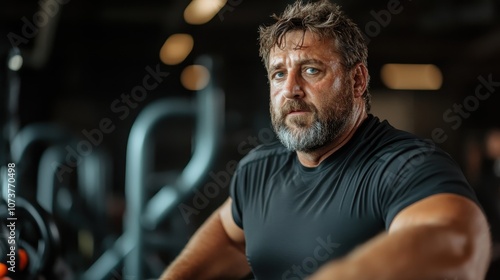 This image shows a bearded man with a thoughtful gaze, resting in a gym setting, reflecting on training efforts and life, embodying calmness and contemplation.
