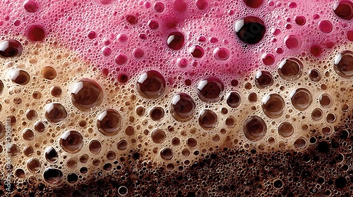 this image shows a close up of bubbles forming on a liquid. the top part of the frame is a bright, vibrant pink, fading into a lighter tone further down