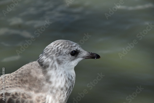 This is a young common gull in nature in summer day. You can see the head of the bird in the picture.