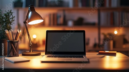 This peaceful workspace features a laptop on a wooden desk, illuminated by a stylish lamp. A pencil holder adds functionality, while soft lighting enhances the calming ambiance, ideal for creativity