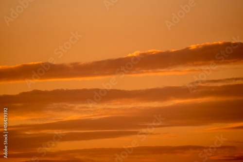 This photograph showcases idyllic clouds in an orange sunset sky.