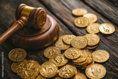 This picture shows a judge's gavel alongside a pile of coins on a wooden table, depicting the linkage between law, justice, and financial matters through symbolic imagery.