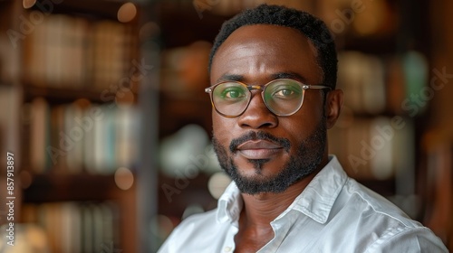 This portrait captures an individual in a well-lit bookstore room, with books neatly arranged in shelves, illustrating a calm and intellectual atmosphere.