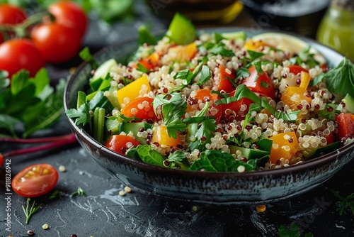 This refreshing scene captures the essence of health with fluffy quinoa grains mixed with a variety of fresh vegetables, aromatic herbs, and a zesty lemon vinaigrette