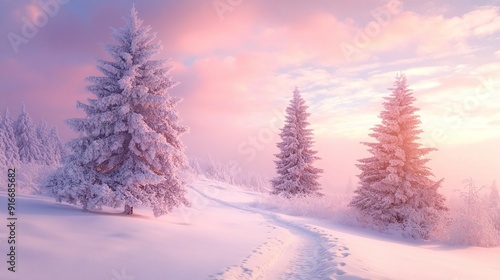 This serene winter landscape showcases two snow-covered trees under a pink sky, with a path winding through the untouched snow