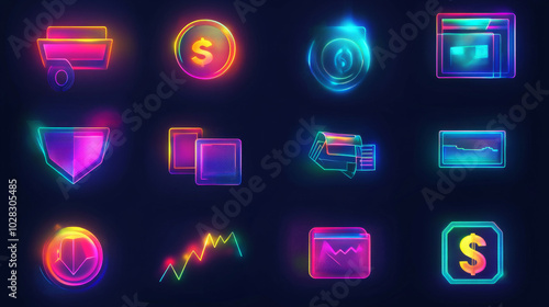 This set includes ten different icons related to money and trading. They are designed in a modern style with geometric neon glow style with particles isolated on background.