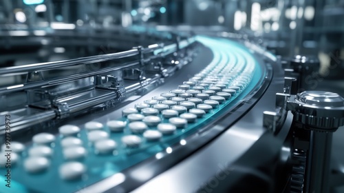 This shows a production line in a pharmaceutical factory with pills moving along a conveyor, emphasizing automated manufacturing and quality assurance