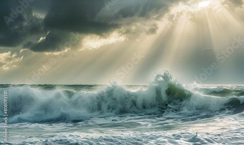 This striking photograph captures the raw power and intensity of big waves crashing against the shore amidst a turbulent sea and stormy sky. Towering waves rise majestically from the depths