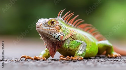 This stunning image captures a vibrant green iguana with intricate details, showcasing its spiked crests and majestic posture, against a blurred natural background.