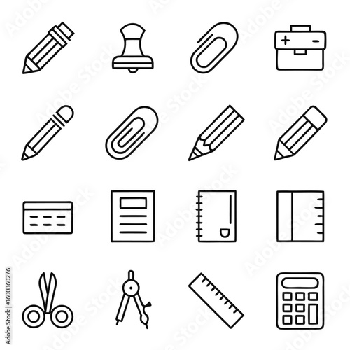 This vector icon set features symbols for school, education, office, and business, illustrating essential signs for web design and computer-related documents like files, calendars, and books