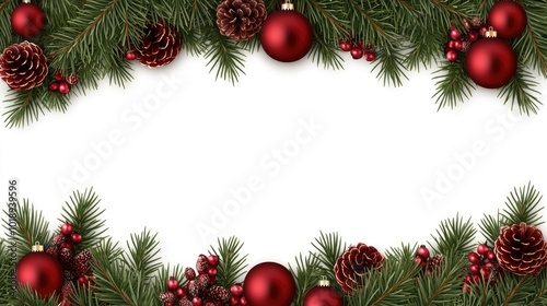 This vibrant arrangement showcases red baubles, pine branches, and pine cones, creating a festive atmosphere perfect for Christmas and New Year celebrations