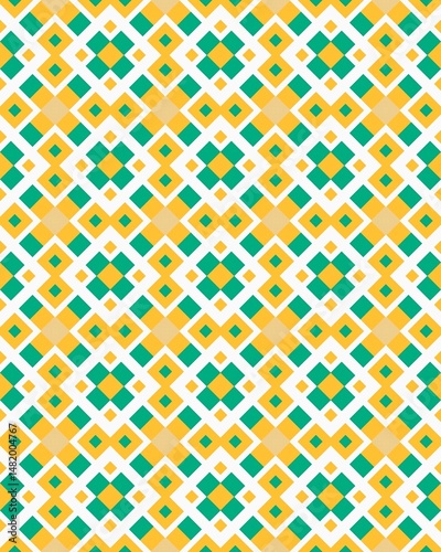 This vibrant design showcases a repetitive geometric pattern of diamonds and squares in green and yellow hues