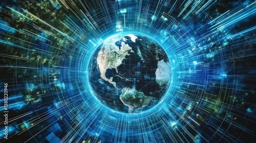 This vibrant digital artwork features Earth at the center, surrounded by dynamic data streams and abstract light patterns that symbolize global connectivity and technology.