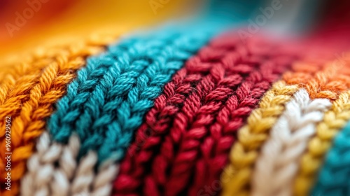 This vibrant knitted fabric displays a rich variety of colors and intricate patterns, highlighting skilled craftsmanship in textile design