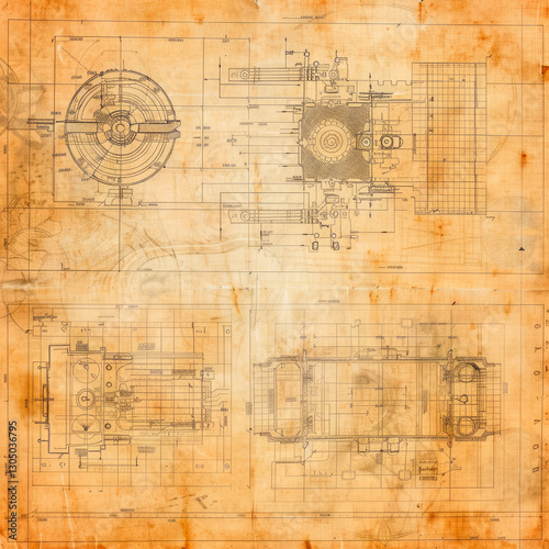 This vintage engineering blueprint features detailed designs of mechanical components and systems, showcasing the complexities of engineering and innovation in design.