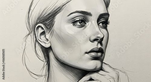 Thoughtful contemplation: A serene pencil sketch of a woman in deep thought, her gaze lost in contemplation, evoking a sense of introspection and quiet reflection.