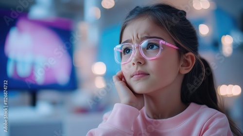 Thoughtful girl in glasses deep in thought, surrounded by colorful lights, gazing to the side, capturing a moment of contemplation in a cozy atmosphere.