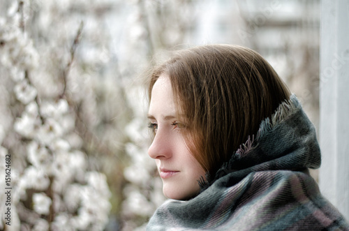 Thoughtful girl, wrapped in a plaid looking into the distance, blossom trees on the background