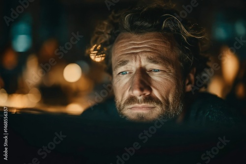 Thoughtful Man in a Cozy Dimly Lit Environment with Warm Bokeh Lights