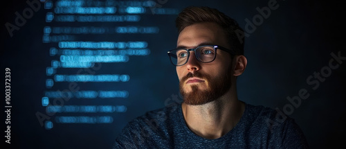 Thoughtful man with glasses against a dark background, looking into the distance.