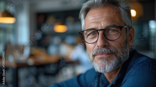 Thoughtful Older Man in Glasses Reflecting on Social Issues in a Modern Café Setting
