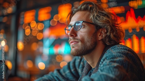 thoughtful young businessman using a laptop while falling arrows from a forex chart are displayed against a grainy background of an office.