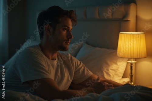 Thoughtful Young Man in Bed Looking at a Dim Bedside Lamp in the Evening, Ideal for Concepts of Reflection and Sleep