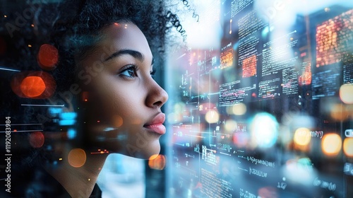 Thoughtful young woman gazing out of a window at an urban scene filled with digital data and glowing lights, representing innovation and technology in modern society