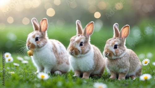 Three adorable rabbits standing on green grass with daisies, with bokeh lighting in the background.