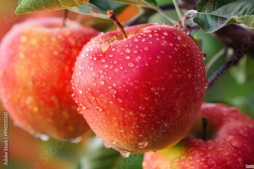 Three apples are hanging from a tree, with one of them being wet