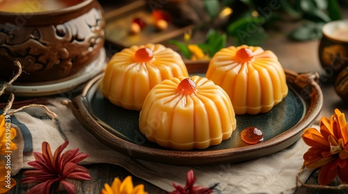Three beautifully arranged jelly desserts with a glossy finish, garnished with a small candy, set in a cozy, natural setting.