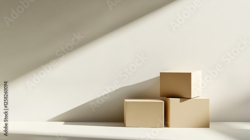 Three Beige Boxes Leaning Slightly Against a Minimalistic Wall with Natural Light and Shadows Creating a Calm and Serene Atmosphere