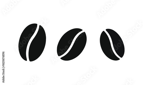 Three black coffee bean silhouettes arranged in a row on a white background isolated on white background