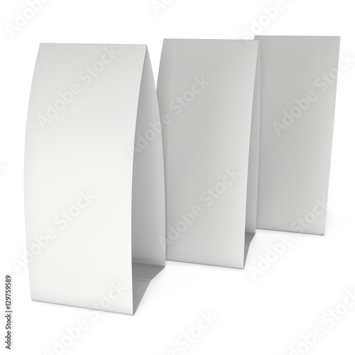 Three blank paper tent cards. 3d render illustration isolated. Table cards mock up on white background.