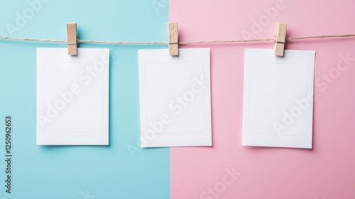Three Blank Photo Frames Hanging on Pastel Background Perfect for Mockups and Designs