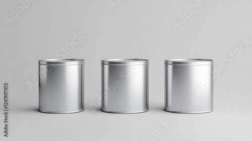 Three Blank Silver Metal Cans on Plain Background, Mockup for Design Use