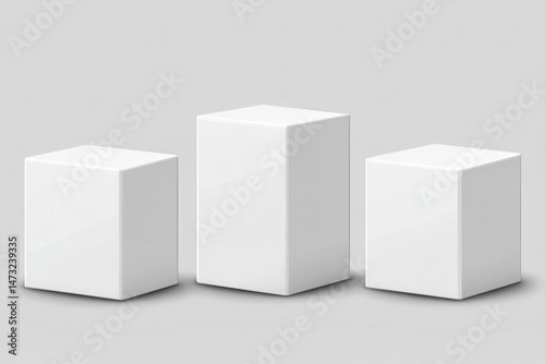Three blank white cube podiums, in a row, against a neutral background. Each cube is a different size, creating visual depth and a sense of gradation. The surfaces are smooth and reflective