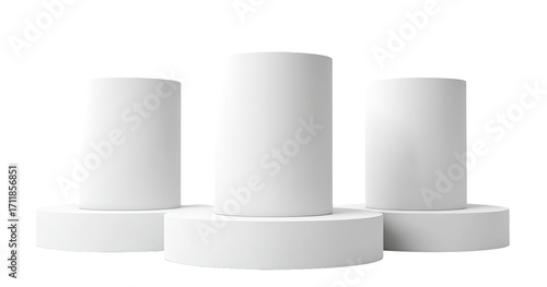 Three blank, white cylindrical podiums arranged in a tiered, winner's-stand style