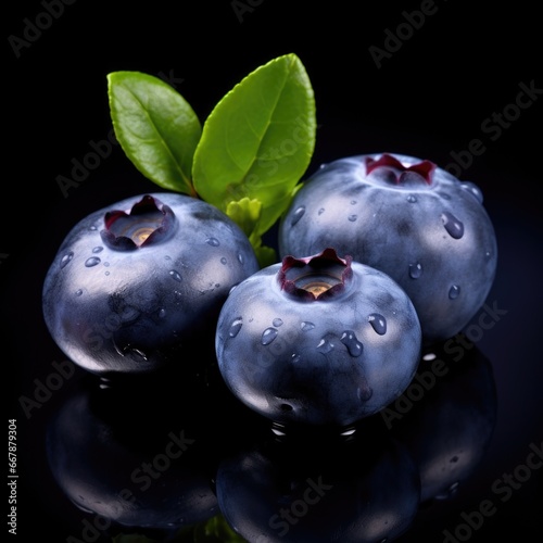 Three blueberries with water droplets on a black surface.