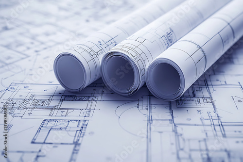 Three blueprints with white paper rolls on top, representing architectural and design concepts.